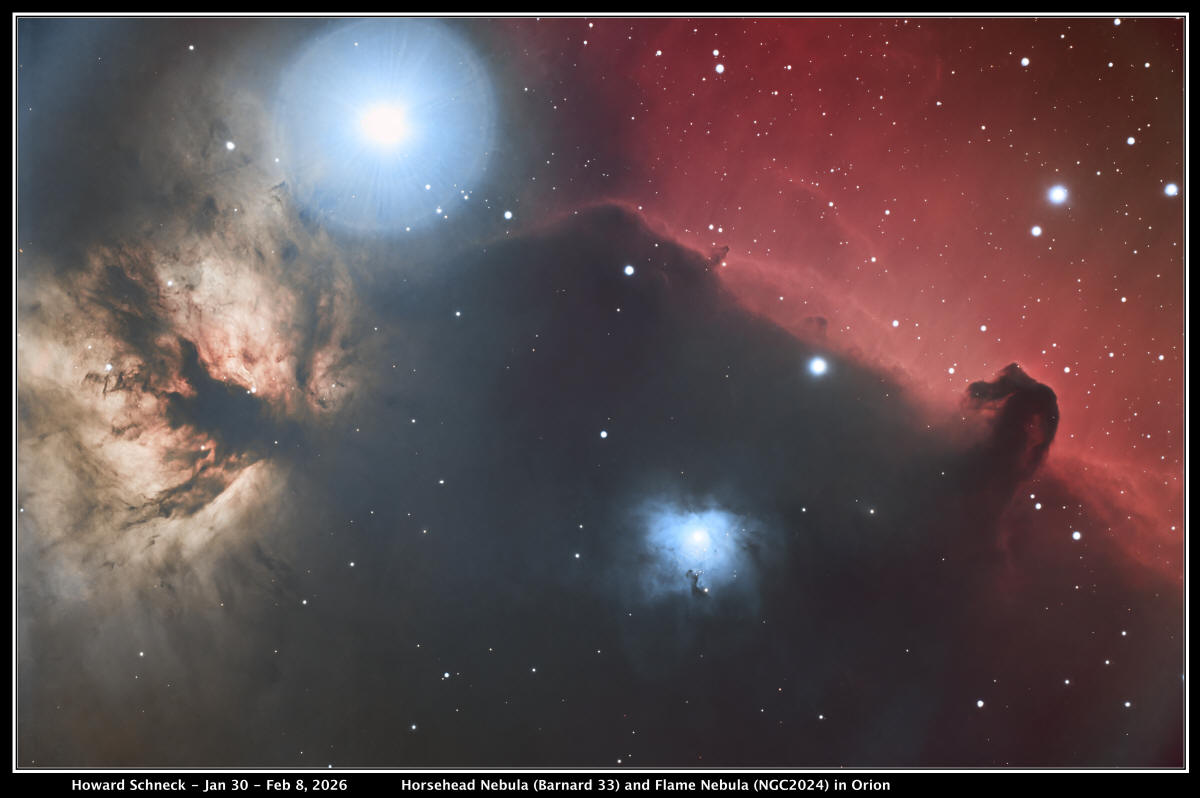 This image shows the Horsehead Nebula (Barnard 33) and the Flame Nebula (NGC 2024) near the constellation Orion's eastern-most Belt star, Alnitak. The Horsehead is a small dark nebula about 1,400 light years from Earth, and its thick dustiness is silhouetted by blocking the light of the bright reddish emission nebula behind it, IC 434. IC 434 is an active star-forming region whose reddish color is the result of emissions from ionized hydrogen gas.The Flame Nebula is part of the Orion Molecular Cloud Complex and is one of the most active star-forming regions in our Milky Way galaxy. It's a hotbed of of cosmic activity where new stars are born from gravitationally collapsing clouds of gas and dust. NGC 2023, to the left of the Horsehead, is an emission and reflection nebula. This reflection nebula is one of the largest in the sky and glows blue due to dust particles scattering the blue wavelengths from the star at its core, HD 37903, in many directions; this is similar to why our daytime sky is blue. Mouseover for labels.