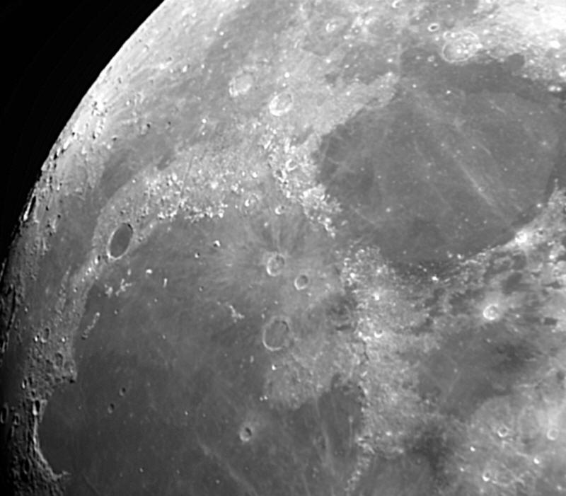 Club member Dave Neunheuser captured this image of the moon's surface during the early morning hours of June 14, 2019, from his suburban backyard. He used a Meade 12-inch, f/8 ACF catadioptric telescope and a ZWO ASI183 monochromatic CMOS astro-camera. Dave controlled the camera with Sharpcap Capture 3.1, assembled the best 10% of 500 frames with Autostackert 2, and processed them with Registax 6. Notable features in the image are the craters Plato, Aristillus and Timocharis, as well as Mare Imbrium and Mare Serenitatis. Also note the Alpine Valley (Valles Alpes) near Plato at the 2 o'clock position.