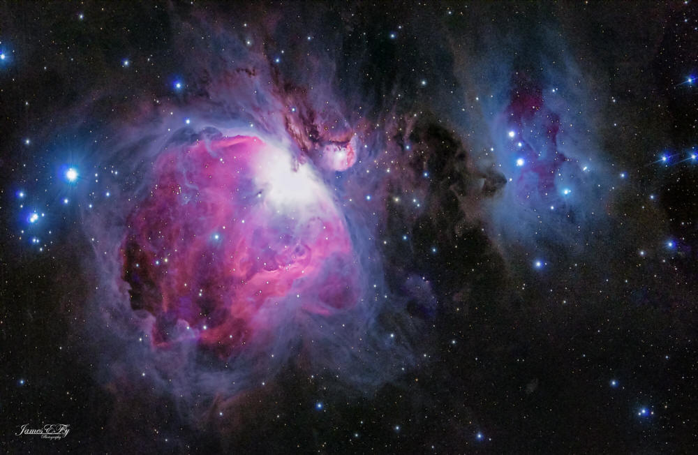 Club member Jim Foy captured this luminous image of M42, the Great Nebula in Orion, flanked on the right by M43 and the Running Man Nebula (NGC 1973, 1975 and 1977). It was taken on November 11, 2018, from Steelmantown in Belleplain State Forest, NJ, with a modified Canon 60D digital SLR camera at the prime focus of a Takahashi FSQ106N 130 mm, f/5 apo refractor on an Astro-Physics AP900GTO German equatorial mount (auto-guiding with PHD2). It was exposed 80 minutes (16 x 5 minute subs) at ISO 800, controlled by BackyardEOS. Post-processing with PixInsight and Photoshop CC.