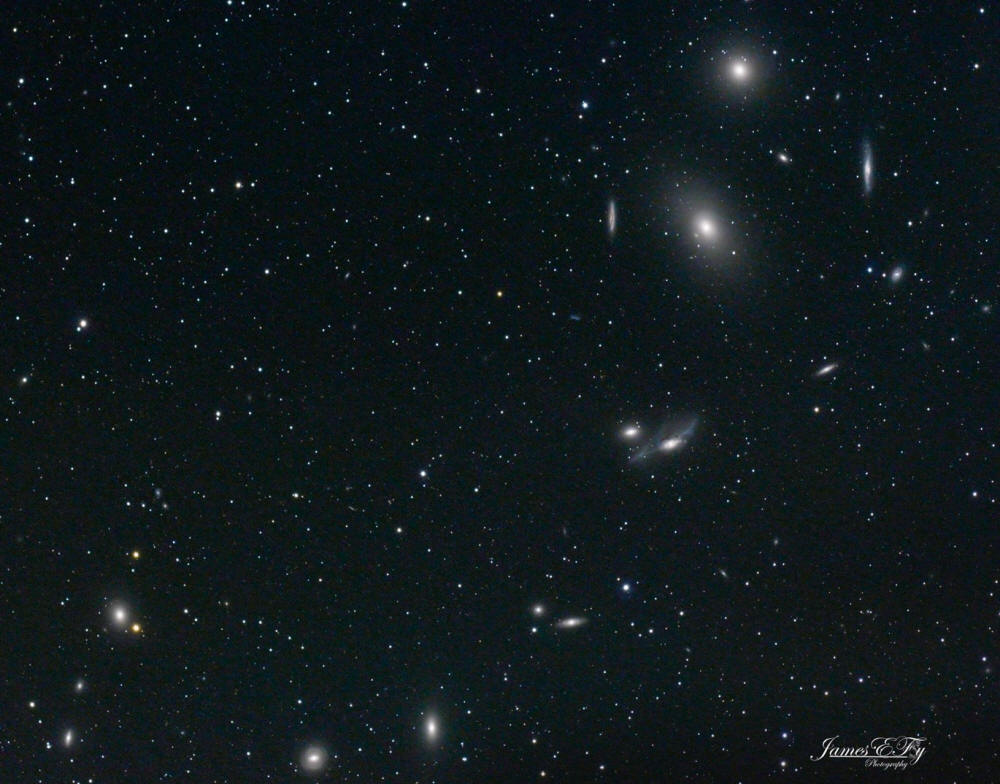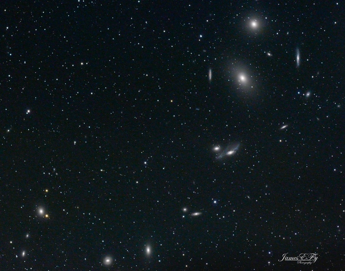 Club member Jim Foy imaged Markarian's Chain, a string of galaxies in the constellation Virgo. This image was captured on 03 & 06-April-2019 from Steelmantown in Belleplain State Forest, NJ, with a Takahashi FSQ106N, f/5 apo refractor on an Astro-Physics AP900 German equatorial mount using a full-spectrum, Hap Griffin modified Canon EOS 60D digital SLR camera. It was exposed a total of 145 minutes (29 x 5 minute subs) at ISO 1600. Autoguiding with PHD2, capture with Sequence Generator Pro and digital post-processing with PixInsight and Photoshop CC.