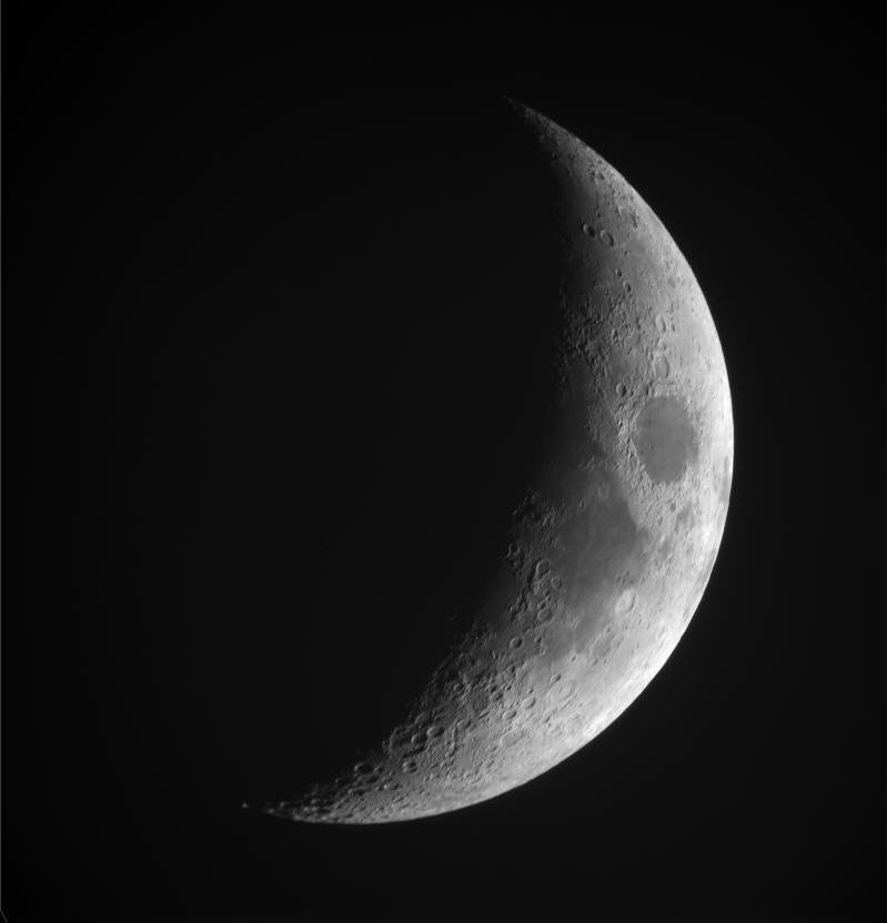 Club member Dave Neunheuser took this detailed image of the Crescent Moon, 27% illuminated, at about 7:00 pm EDT on September 21, 2020, just minutes after sunset, but he used a ZWO 850 nm infrared filter to squelch the effects of a blue sky. It was taken with a ZWO 183 cooled monochrome camera on a vintage Takahashi 200 mm f/4 astrograph. It represents half of 3,200 frames captured and processed with AutoStakkert!, RegiStax, ImagePlus and Photoshop CS2.