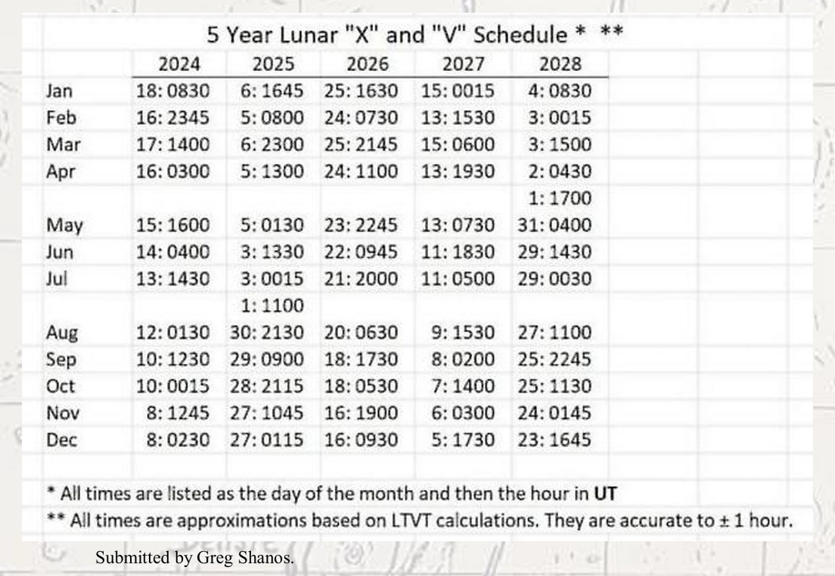 the Moon’s nominal 29.5 day synodic period (phase-to-phase), favorable dates for