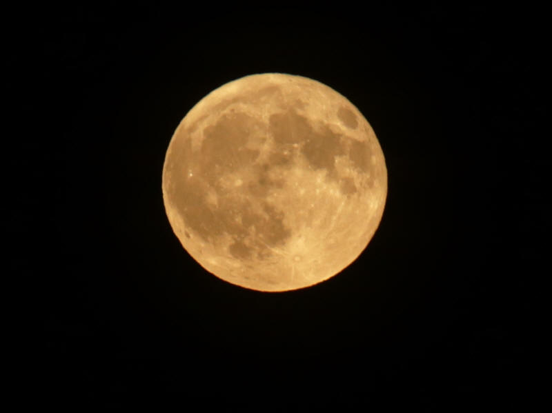 This month's Full Moon was on September 16, 2016, at 3:05 pm EDT and is this year's Harvest Moon (since the equinox will be on September 22nd at 10:21 am). There was also a penumbral eclipse earlier in the day, the mid-point occurring at 2:54 pm when the Moon was still 45° below the horizon for observers in our area (nominally 40°N, 75°W). This image was captured at 7:41 pm, 27 minutes after moonrise at 7:14 pm and 35 minutes after sunset at 7:06 pm, when the moon was at 4½° altitude. It was taken from Swede Run in Moorestown, NJ, with a Canon 6D digital SLR camera and a Canon 400 mm f/5.6L lens on a fixed tripod (cropped to roughly a quarter of the original size to a field about 1.3° wide x 1.0° high). It was exposed 1/500 second at f/11, ISO 3200 and daylight white balance. The moon's golden color (because of the low altitude) is essentially the same in the picture as it was visually at the time. However, click the picture (or click here) for a larger version with increased color saturation that better shows a thin rim of color at he upper limb (greenish) and the lower limb (reddish) due to atmospheric chromatic aberration. Thanks to Steve Mattan's web page for pointing out this effect.