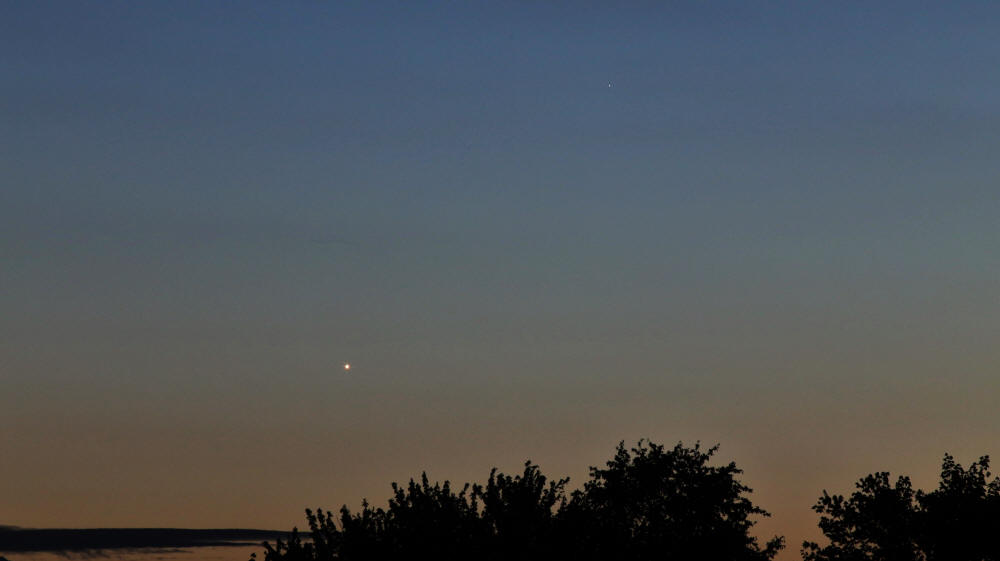 On August 27, 2016, Venus (above) and  Jupiter (below) were at conjunction as the former passed the latter with Venus moving eastward at a considerably faster rate than Jupiter. Circumstances of the conjunction and the close appulse are tabulated below. This image was captured from Swede Run in Moorestown, NJ, at 8:14 pm EDT, when the two bright planets were 5' 51" apart (roughly a fifth of a moon diameter) and just under 4° altitude. Taken with a Canon 6D digital SLR camera (on a fixed tripod) and a Sigma 70 to 300 mm f/4-5.6 apo zoom lens set to 300 mm focal length. Exposed 1/10 second at f/5.6, ISO 1600. The view in 16x70 binoculars was splendid, starting at 7:50 pm when they descended out of clouds into a relatively clear band of sky. Mercury, which had been a companion of Venus since mid-July 2016, was 5° south of the Venus-Jupiter pair at the time of the picture. As a result, Mercury is roughly at the 7:30 o'clock position relative to Venus and Jupiter, and since 5° is equivalent to 50x the nominal 6 arc-minute spacing between Venus and Jupiter, Mercury is out of the picture behind the trees (at ¼° altitude).