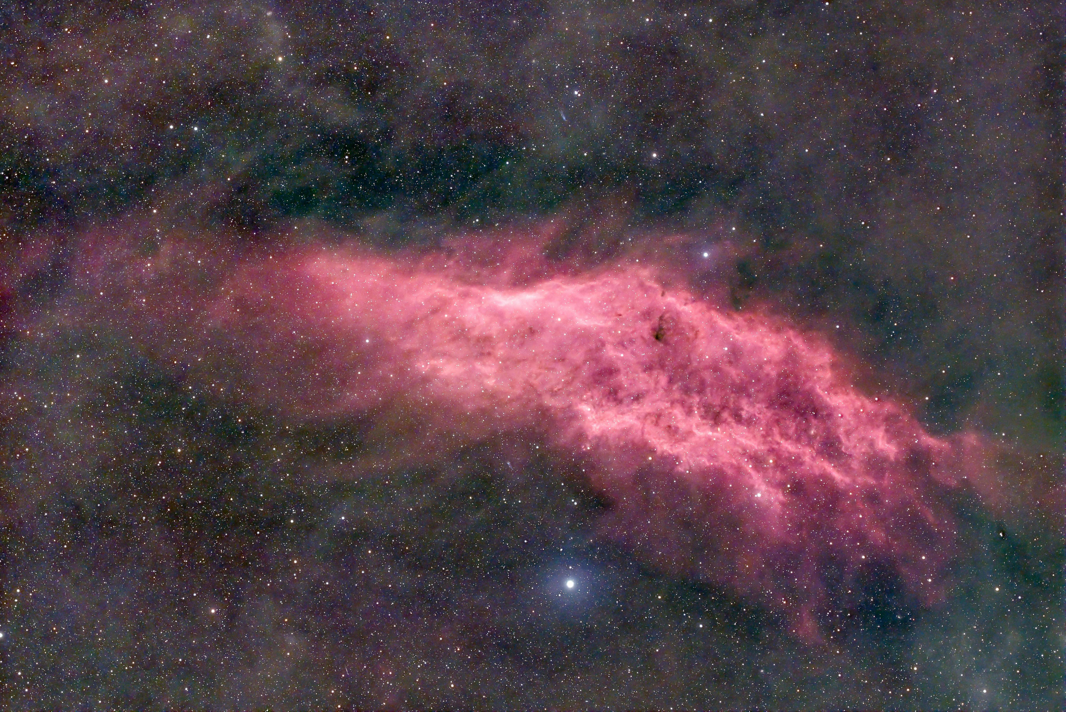 Club member John McDaniel captured this stunning image of the California Nebula, NGC 1499 in Perseus, during the first week of December 2024 from his backyard in Mt Laurel, NJ (by no means a dark site!). He used a ZWO ASI2600MC camera and a Sharpstar Askar FRA500 90 mm, f/5.6 quintuplet refractor with a 0.7x focal reducer for an effective focal length of 350 mm. He captured 100 x 120 second subs for a total exposure of 3 hr 20 min. The bright star below the nebula is magnitude 4.0 Menkib, Xi Persei. Click here, or on the picture, for a larger version.